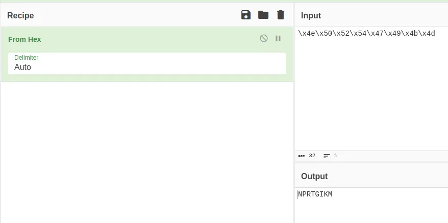 Notre flag théorique final est donc \x4e\x50\x52\x54\x47\x49\x4b\x4d Qui équivaut à NPRTGIKM