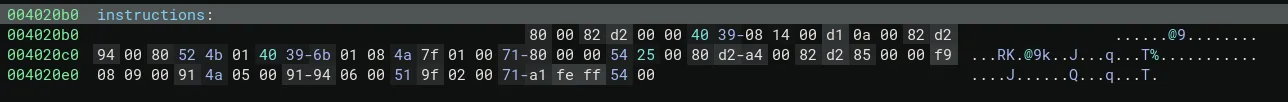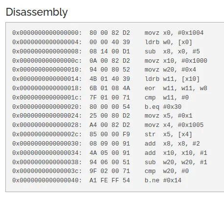 Voici la liste d’opcode écrit dans la stack 2 (d’instructions) du processeur virtuel : 800082d200004039081400d10a0082d2940080524b0140396b01084a7f01007180000054250080d2a40082d2850000f9080900914a050091940600519f020071a1feff5400