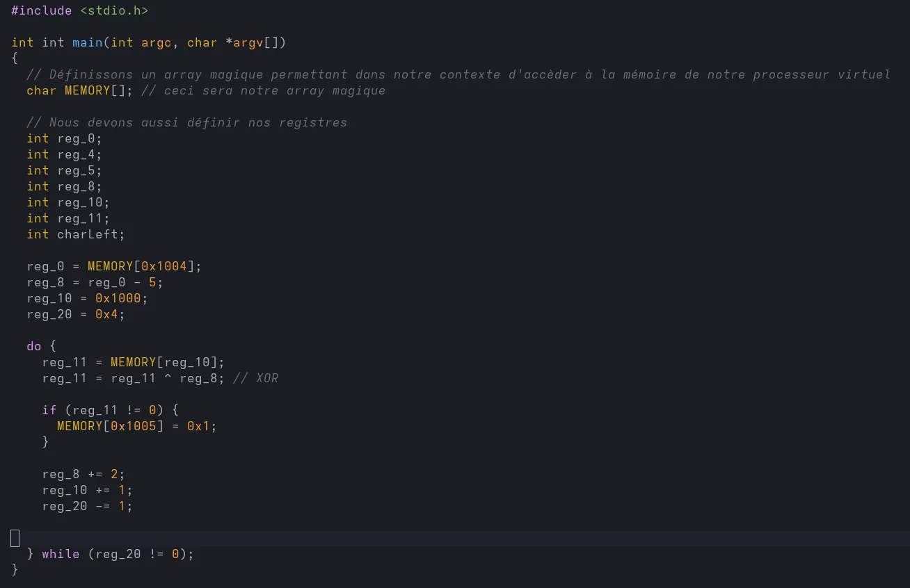 3. Conversion en Assembleur : Cette étape a représenté le coeur du projet. J’ai traduit la logique du programme du C vers l’assembleur, me confrontant évidemment à des défis inattendu, bien au delà de la simple traduction.