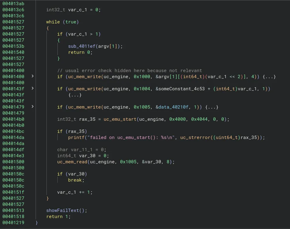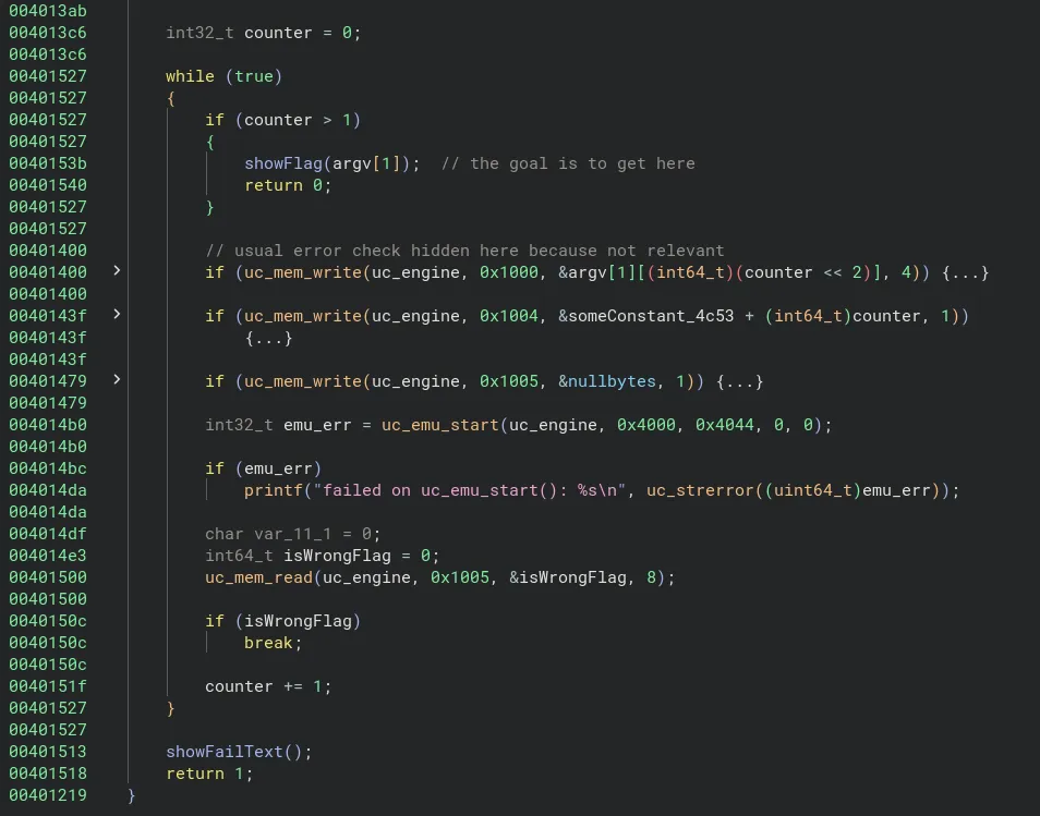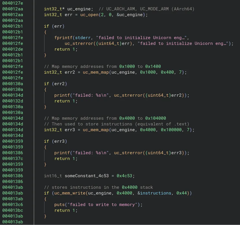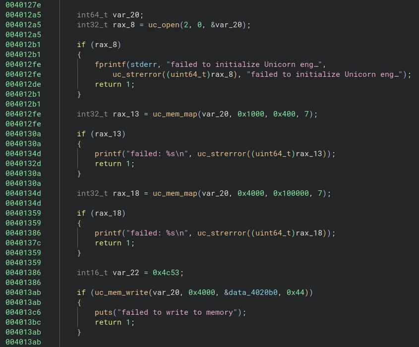 Finalement, nous avons la fonction uc_emu_start qui est appelé et qui lance l’émulation dans ces conditions grâce aux données insérées dans la stack jusqu’à présent.