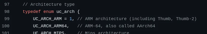 Nous voyons que uc_open prend un paramètre d’architecture, de mode, et un pointeur sur (supposément) une structure uc_engine.