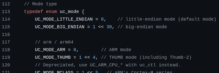 Le mode pourrait aussi être UC_MODE_LITTLE_ENDIAN, mais cela revient probablement au même si ARM utilise le little endian par défaut.