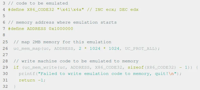 uc_mem_map semble permettre de définir une plage de mémoire utilisable pour l’émulation du processeur, quant à uc_mem_write, elle semble permettre d’écrire un nombre de bytes à une adresse donnée. Nous avons donc deux fonctions permettant de manipuler les données écrites dans la mémoire virtuelle.